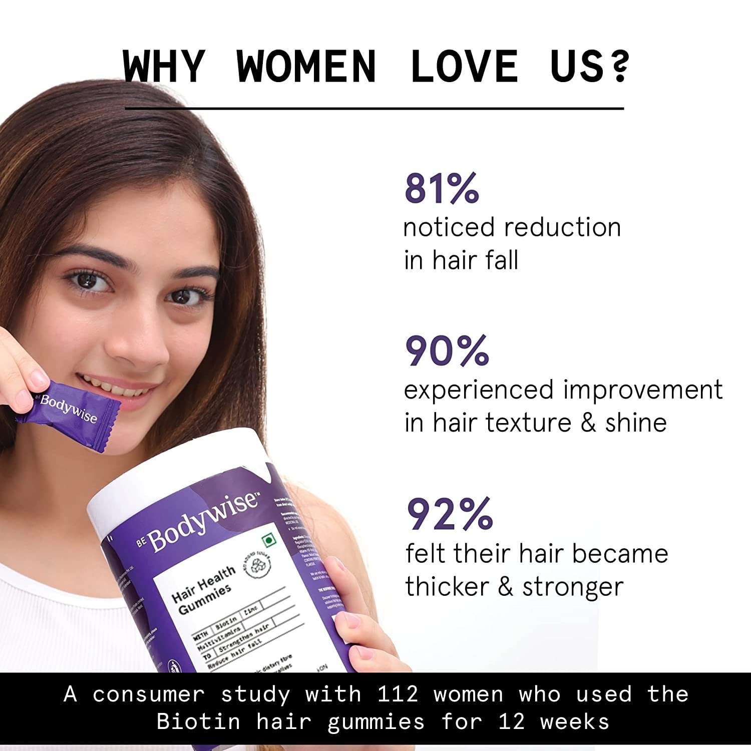 Bodywise Biotin Hair Gummies | No Added Sugar | High Potency Biotin Supplements for Stronger Hair | Reduce Hair fall with Delicious Strawberry Flavoured Gummies | Added Zinc & Multivitamins | 60 Day Pack | 60 Gummies